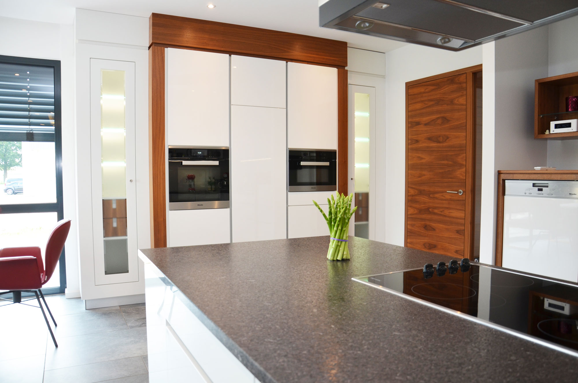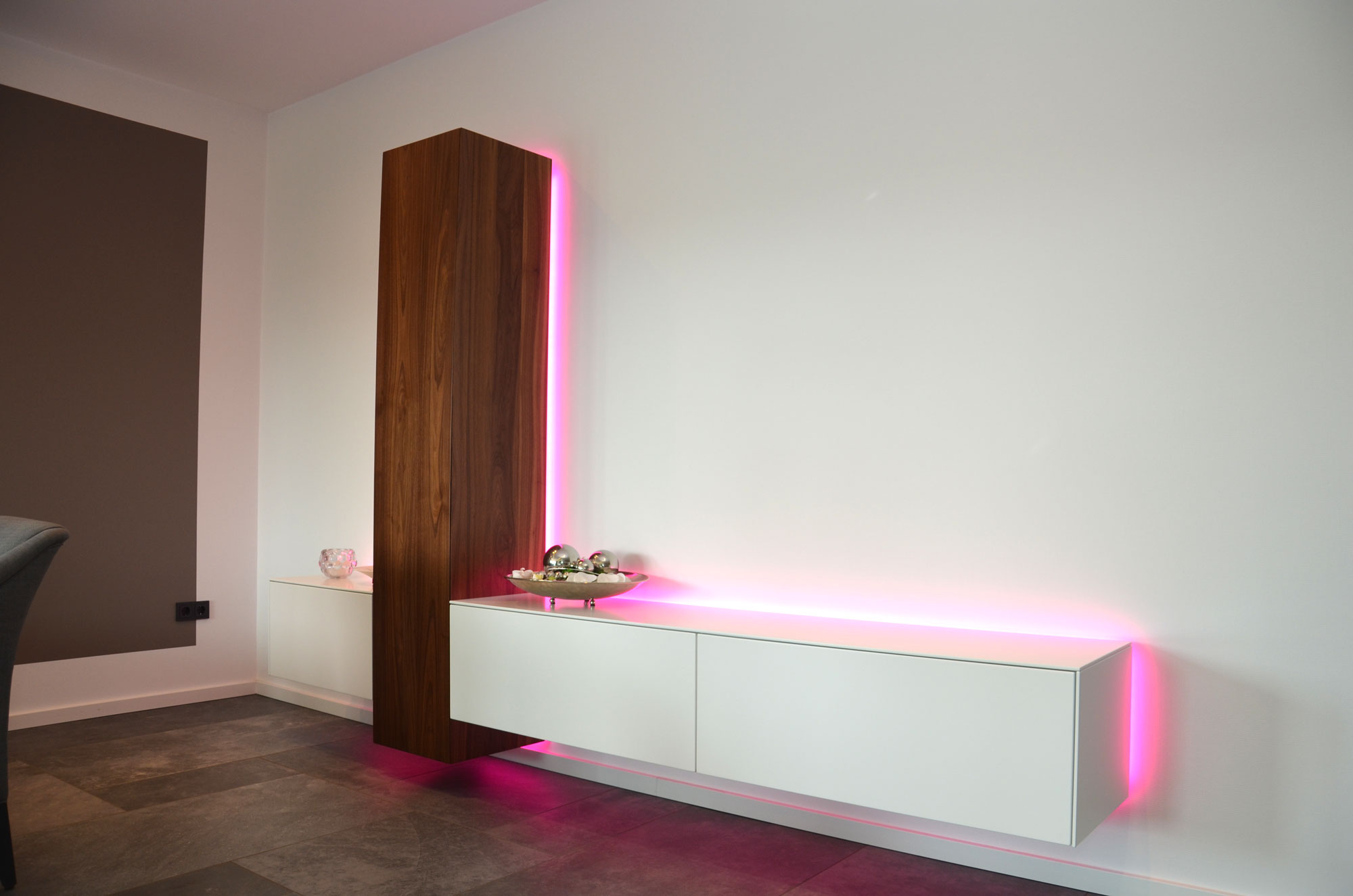 Möbel: Tischleranfertigung, Lack weiß, hochglanz lackiert – kombiniert mit Nussbaum massiv/ Furnier