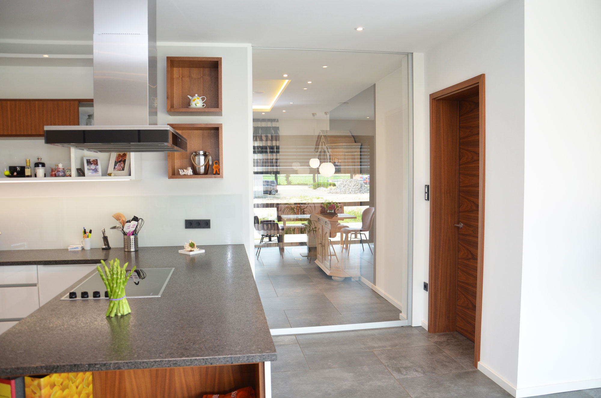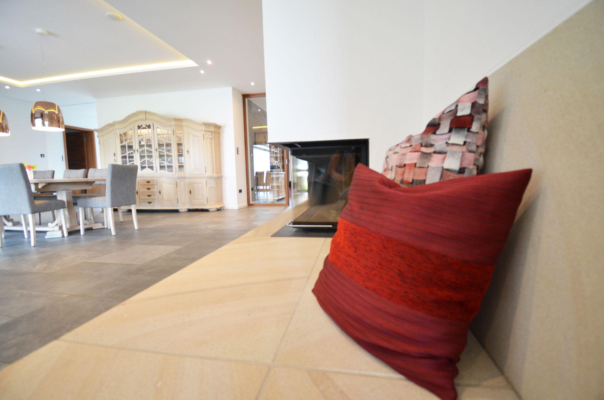 Auf Wunsch des Bauherrn wurden der Kamin und ausgewählte Möbelstücke aus dem alten Haus übernommen – als persönliche Erinnerungsstücke in einem modernen Umfeld.