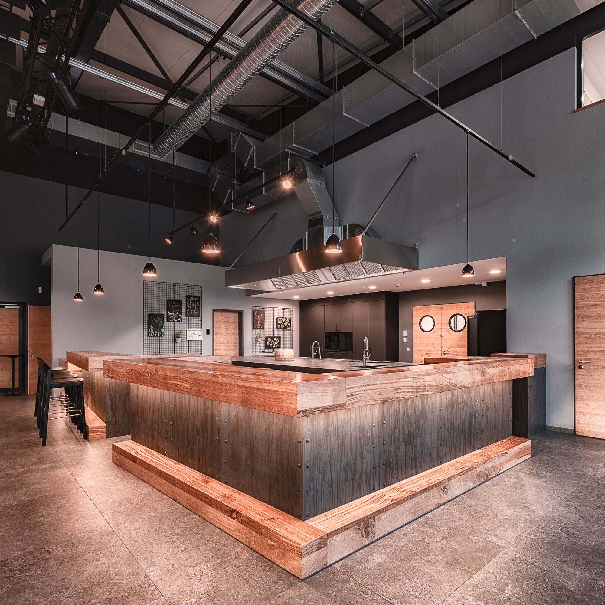 Bei der N&M Genuss Brauerei wurde Architektur konsequent von innen nach außen gedacht. Ausgangspunkt war die Schauküche, um die sich Eventfläche, Grillküche und Großküche entwickelten.