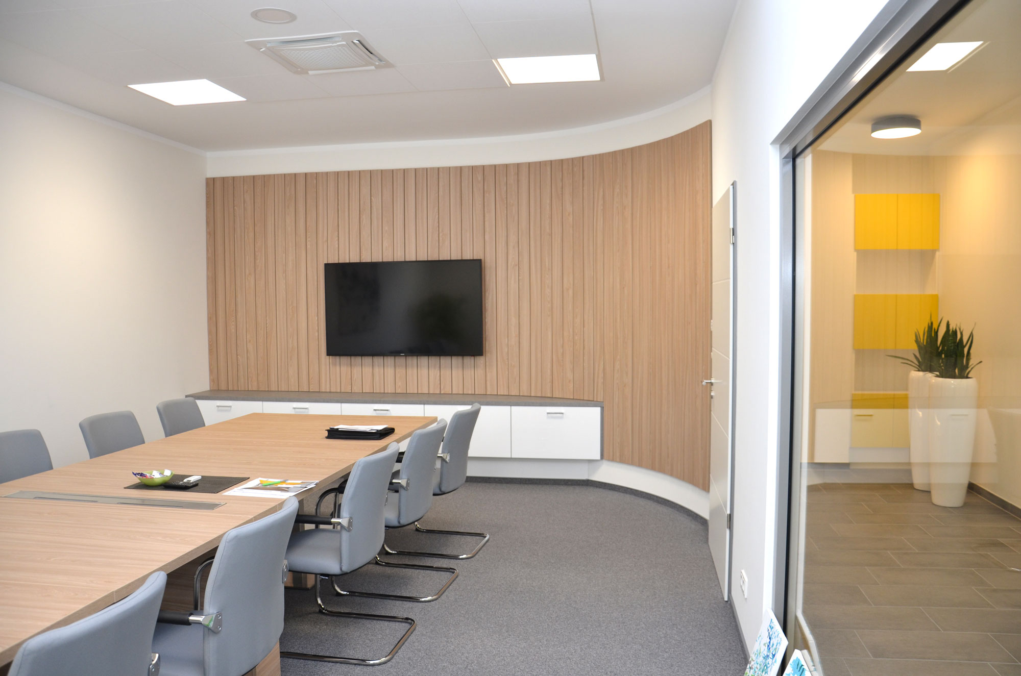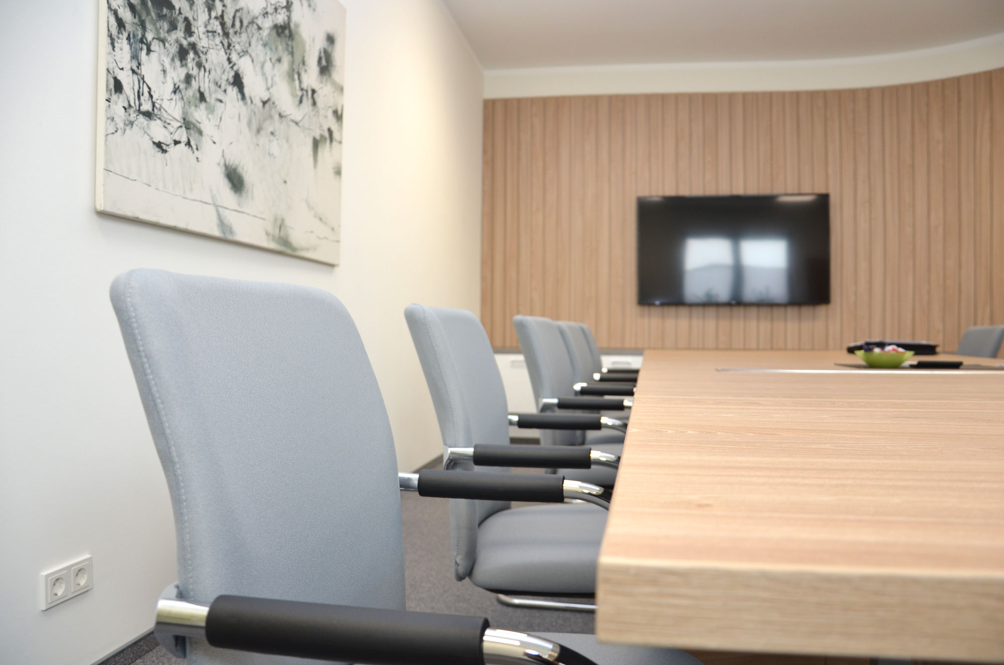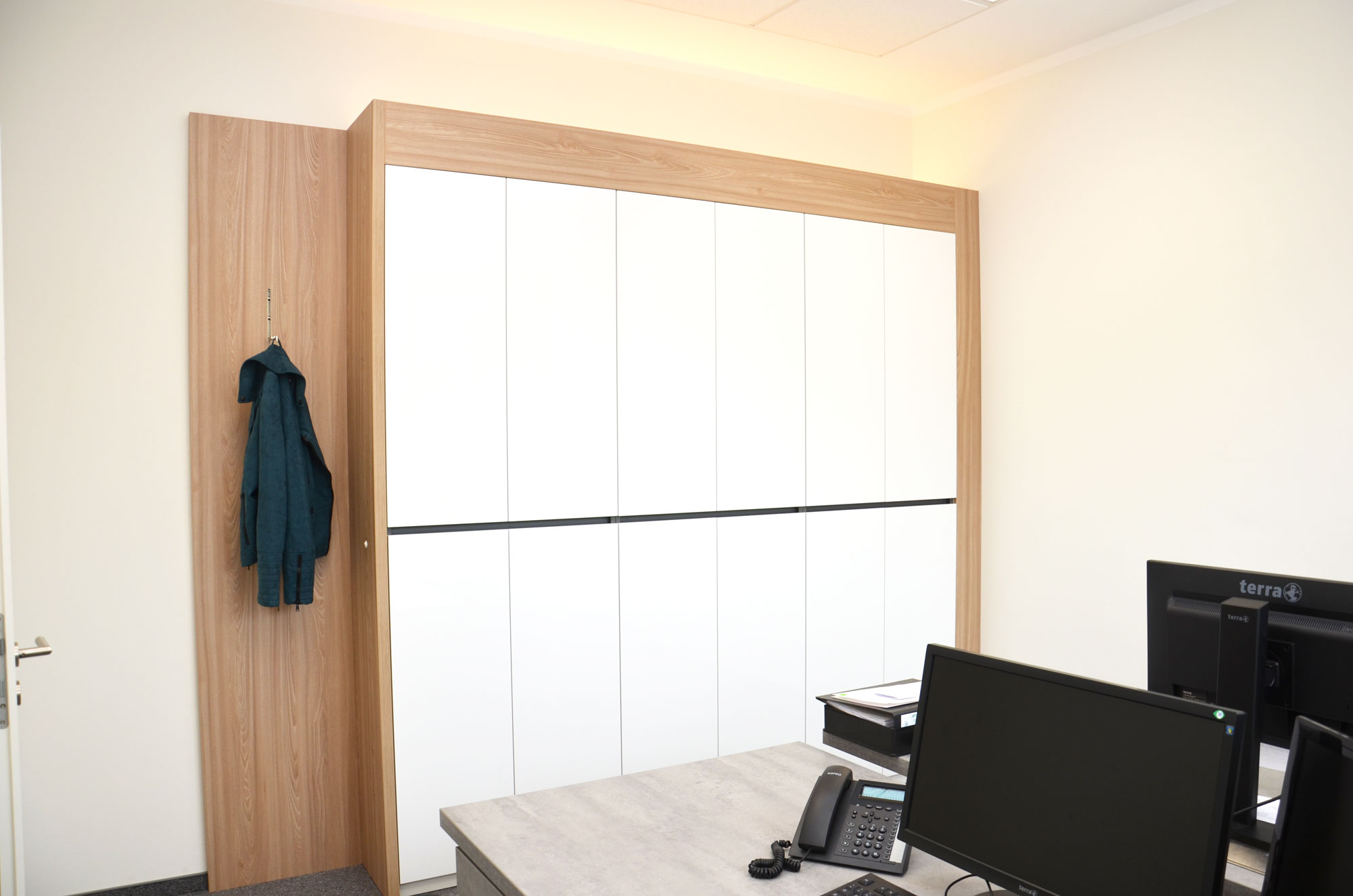 Ein besonderes gestalterisches Element bildet der Besprechungsraum mit einer markant gerundeten Wand in Esche, die als Blickfang fungiert und gleichzeitig eine einladende, geschützte Atmosphäre schafft. Hinter dem Empfangstresen wurde eine kompakte Pantry integriert – funktional, unaufdringlich und perfekt in das Gesamtkonzept eingebunden.
