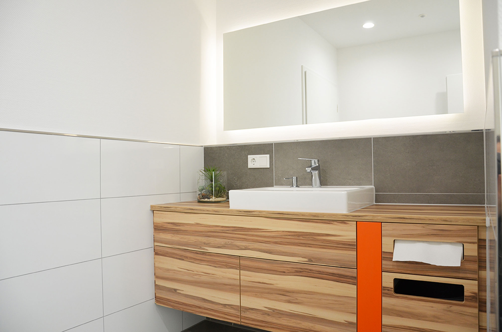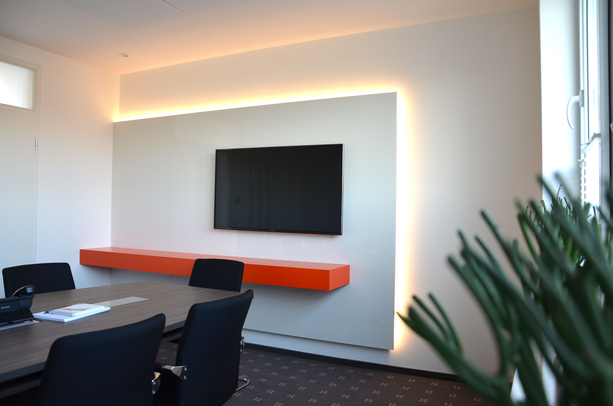 Während einer frühen Besprechung fiel mein Blick auf die vielen Gesetzesbücher, die den Arbeitsalltag der Mitarbeitenden prägen – daraus entstand die Idee des orangefarbenen Balkens als Symbol für Wissen, Struktur und Bewegung. Dieses Designelement zog sich später durch das gesamte Möbelkonzept und wurde schließlich sogar zum Impuls für die Weiterentwicklung des Firmenlogos. Bis heute steht der orangefarbene Balken in den Büroräumen für die Geschichte und Entwicklung der Standorte – ein starkes visuelles Statement für Kontinuität und Fortschritt.