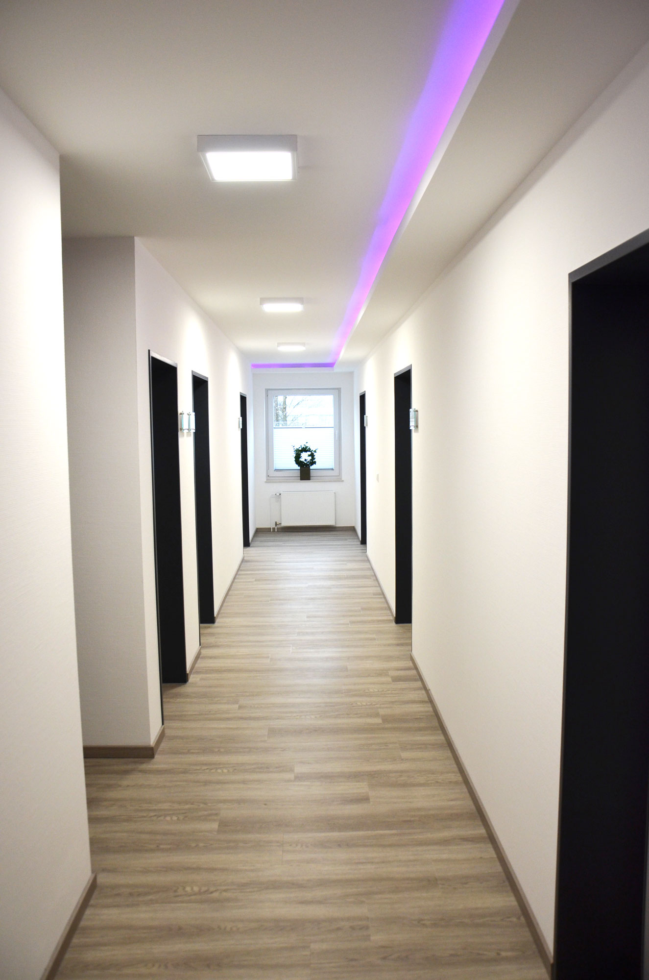 Die größte Herausforderung lag in der geringen Deckenhöhe des Bestandsgebäudes. Trotzdem gelang es, durch gezielte Deckenkorrekturen und abgehängte Teilbereiche mit integrierten LED-Leuchten ein großzügiges und modernes Raumgefühl zu schaffen. Der Fokus lag auf einer klaren Struktur ohne Überladung – handwerklich präzise, aber visuell leicht.