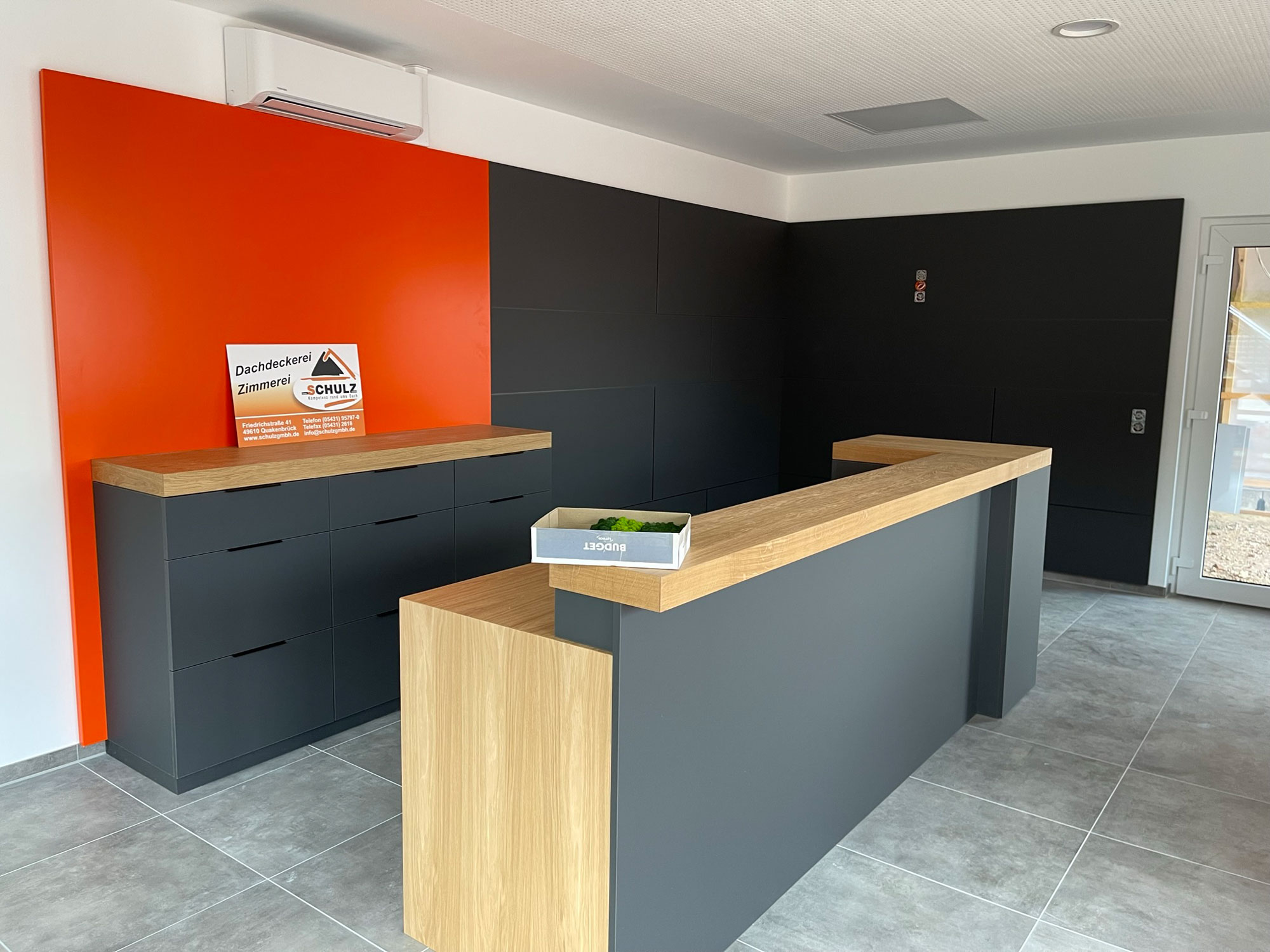 Für die Zimmerei und Dachdeckerei Schulz GbR in Quakenbrück entstand ein modernes Innenraumkonzept im Rahmen eines Umbaus im Bestand. Ziel war es, die handwerkliche Tradition des Betriebs mit einer zeitgemäßen, klaren Raumgestaltung zu verbinden – reduziert, funktional und dennoch mit starker Identität.